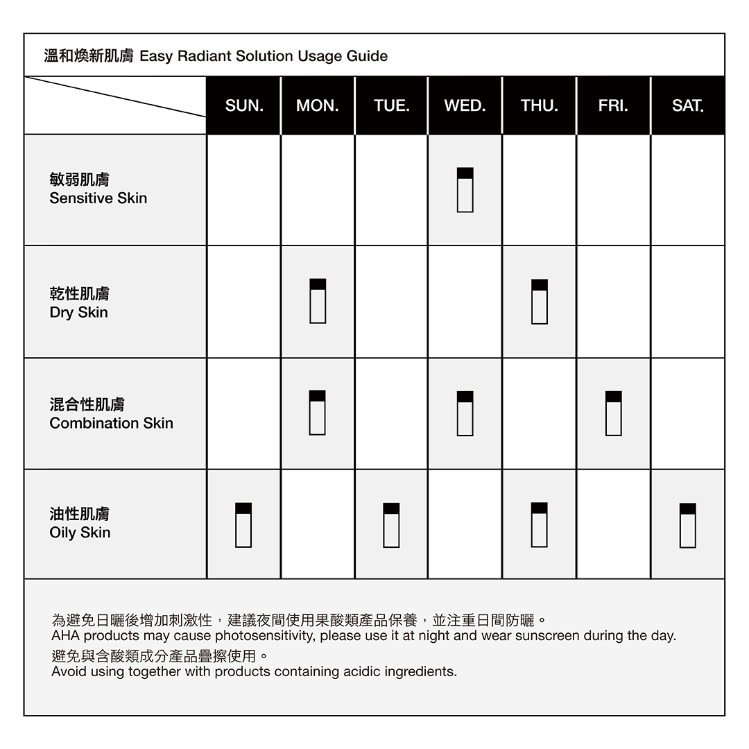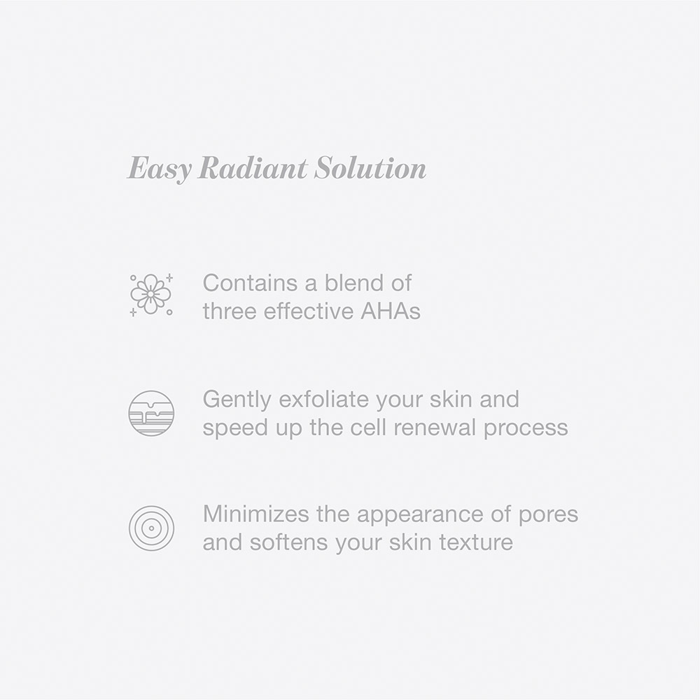 This mild exfoliating solution is here to improve your skin texture and increase suppleness. With our special multi-acid blend and soothing plant extracts, your skin will be nourished in the process of renewal. Add this into your night routine and with consistent use, the results are sure to impress you - revealing the brightness hidden within.