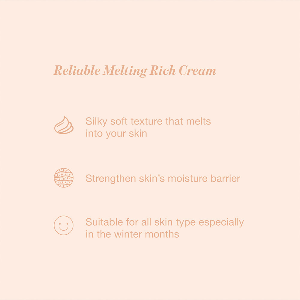 The Reliable Melting Rich Cream was created for thirsty skin that needs some extra attention and pampering. It is thoughtfully formulated into a silky texture that melts right into your skin, instantly deep-conditioning and diminishing signs of dehydration. We discovered that combining a variety of effective and clinically-studied ingredients like Shea Butter, Yam Extract and Matrixyl will most thoroughly and effectively restore the skin's moisture barrier to a healthy state. This is the cream you can rely on to keep your skin looking dewy, supple and radiant all through the dry winter months.
