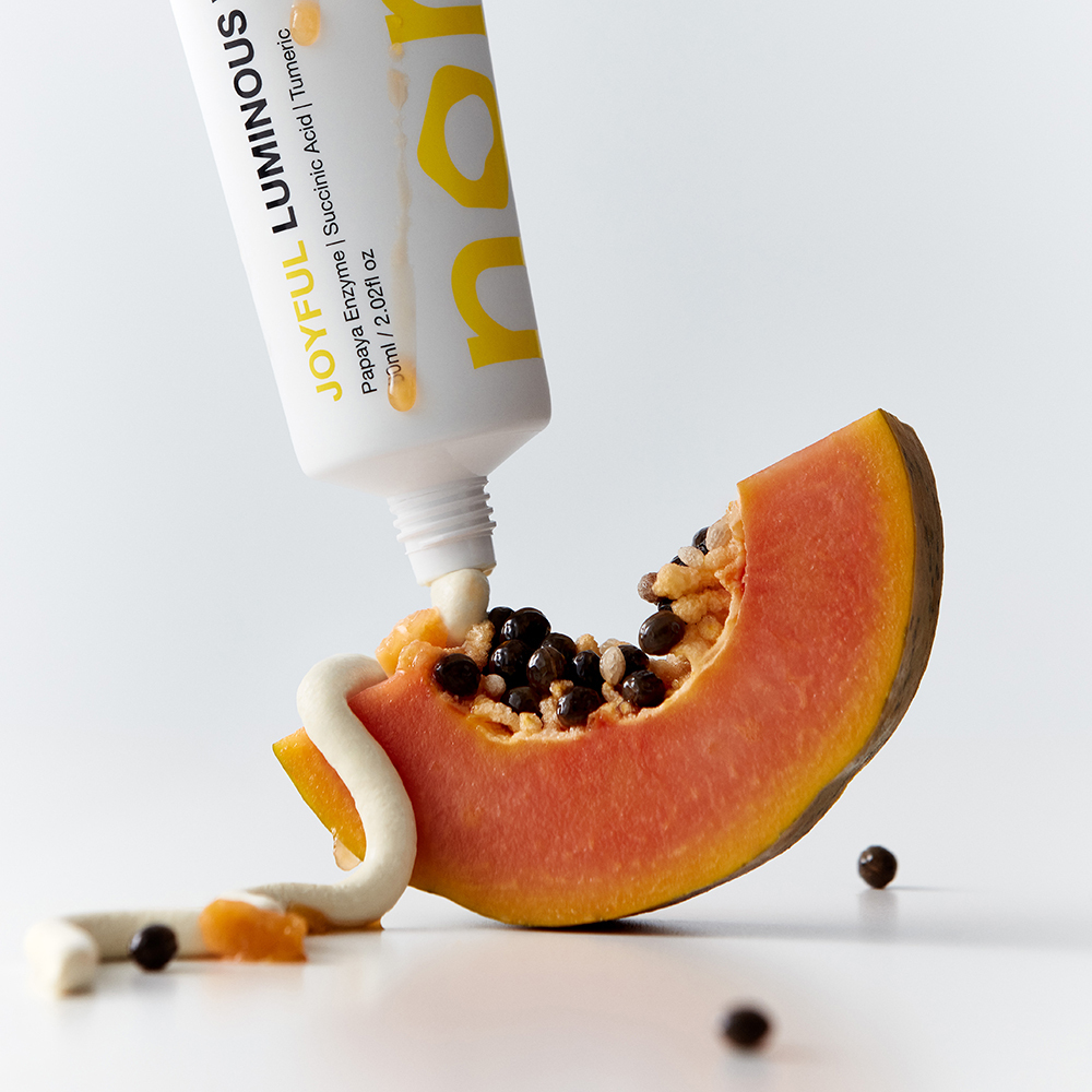 充滿空氣的輕盈霜體泥狀面膜,溫和不刺激的有效成分幫你亮膚、柔順膚觸並清除肌膚多餘的老廢角質。配方中的天然木瓜酵素與琥珀酸成分,能夠調理肌膚達到滑順與恢復光澤。薑黃成分舒緩肌膚,改善暗沉與膚色不均。