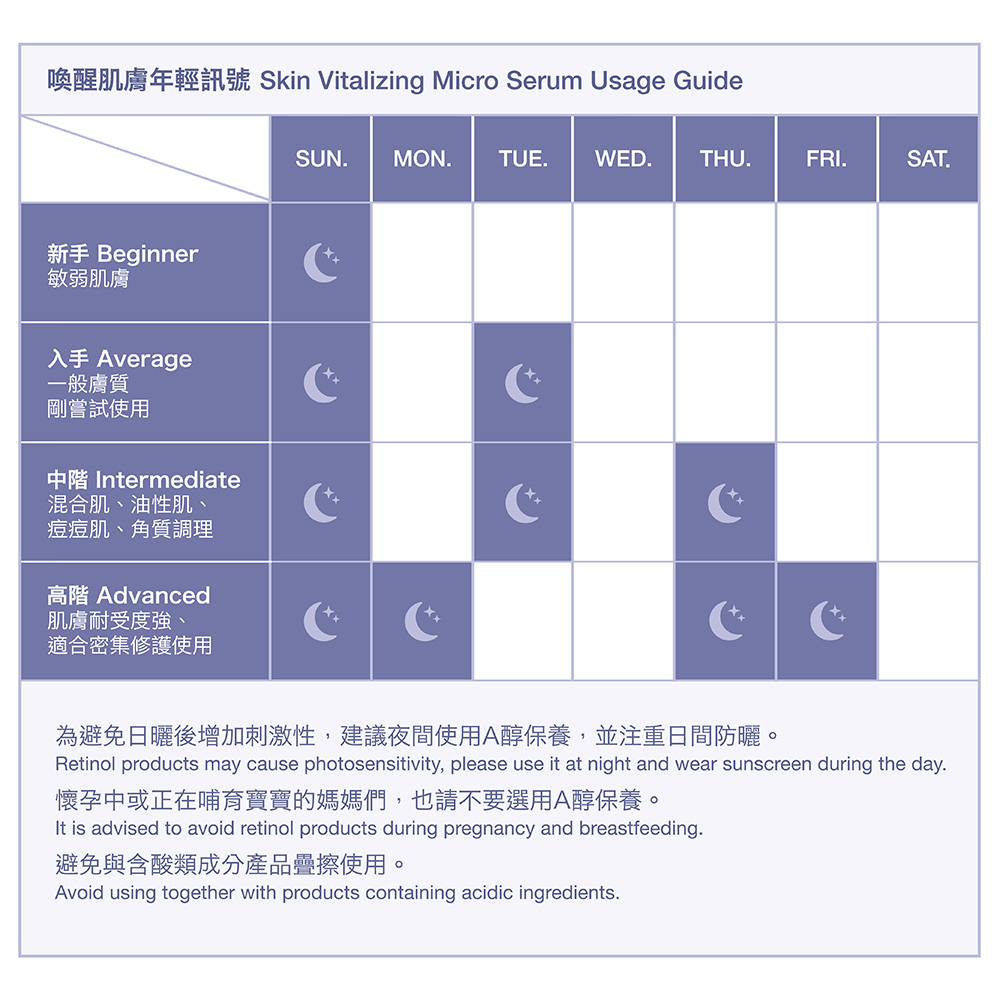 不建議在白天日曬場合或是醫美療程後恢復期使用,使用期間請務必使用防曬產品;懷孕中或正在哺乳的媽媽也請避免使用A醇保養產品。