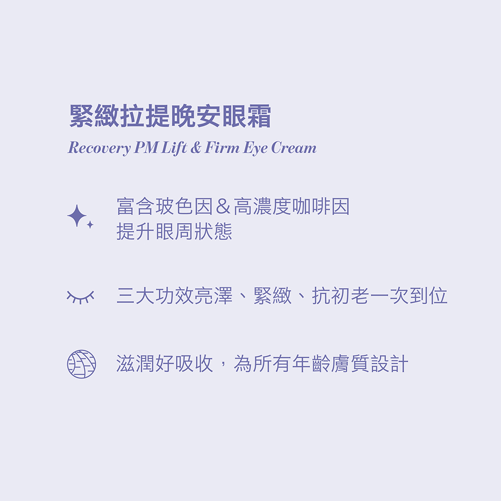 富含豐富的玻色因,為對抗初老跡象的秘密武器;搭配高濃度咖啡因,幫助修護細紋和緊實眼周肌膚。絕對是你夜間保養不可缺乏的好BFF。起床時,眼周明顯感受到光采有活力,緊緻有精神。