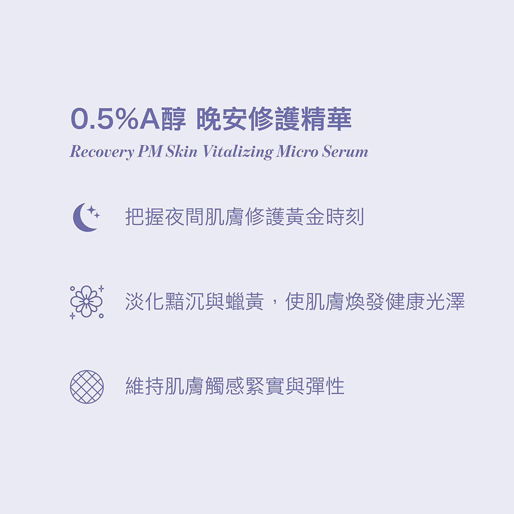 維他命C是日間護膚的關鍵,能有效舒緩肌膚的外在負擔,無論在室內或室外,都能幫助肌膚保持穩定狀態。而當一天結束後,維他命A醇便成為修復的主角,幫助肌膚進入高效修復模式,促進新陳代謝,帶來更加細緻光滑的肌膚。早C晚A,兩步驟簡單又有效,讓肌膚提亮緊緻,保養變得更輕鬆、更有感!